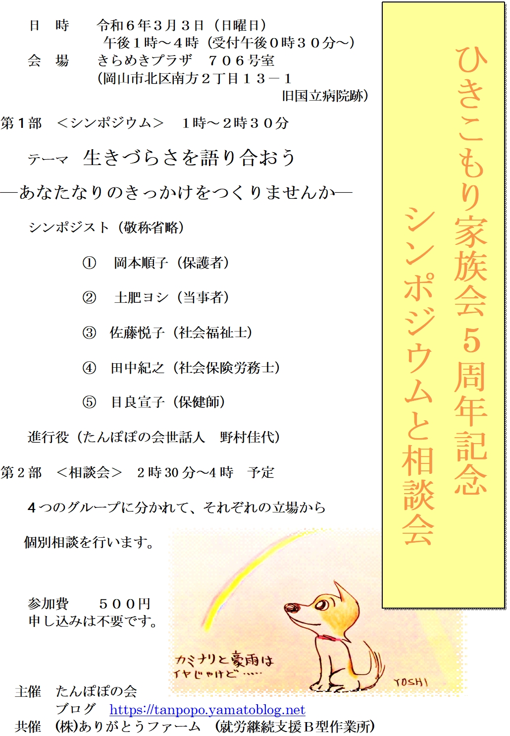 3月3日の5周年記念シンポジウムと相談会にお越しいただいた皆様、ありがとうございました。当日の山陽新聞の朝刊に、5周年記念シンポジウムと相談会のご案内とともに、38年のひきこもりを経験された当事者の方が、家族会への参加を契機に、昨年から作業所に通い始め、自分の居場所として毎日絵を描く仕事をしていることが紹介されました。長期にひきこもっている方と同居されているご家族には、希望につながるお話であったかと思います。シンポジウムの当事者の方のお話は、心に響くものがありました。また、相談会には数組の方が参加されて、心の内を吐露されました。相談の時間は短すぎて、中途半端であったかと思いますが、今後続く家族会にぜひ足を運んでください。何か新たな一歩が始まると思います。ともに考え悩む時間を共有したいと思います。